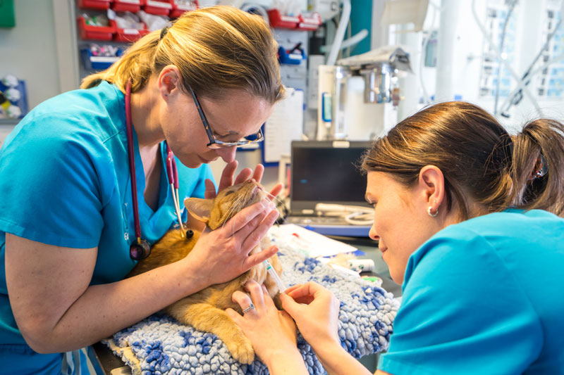 Vaccination appointments are nice and quick, usually taking around 15 minutes. When you arrive, our lovely reception team will check you in and guide you to either the dog or cat waiting area. One of our vets or nurses will then call you through to the consult room, where they’ll give your pet a quick health check and chat through which vaccinations are due. The vaccine itself is given either in the scruff of the neck (the loose skin at the back) or, for kennel cough, as a little nose spray. Afterwards your pet will get lots of treats, cuddles and praise—then you’re all done!