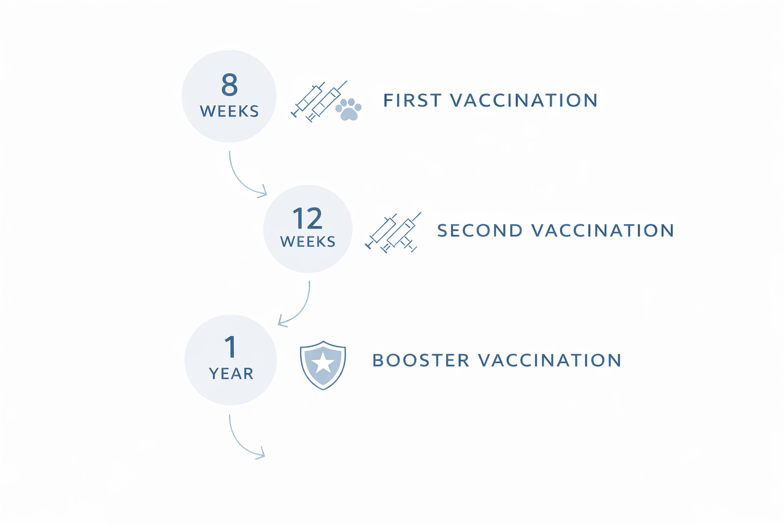 - 6–8 weeks old – First vaccination (DHP core vaccine; Distemper, Hepatitis, Parvovirus, and Leptospirosis)